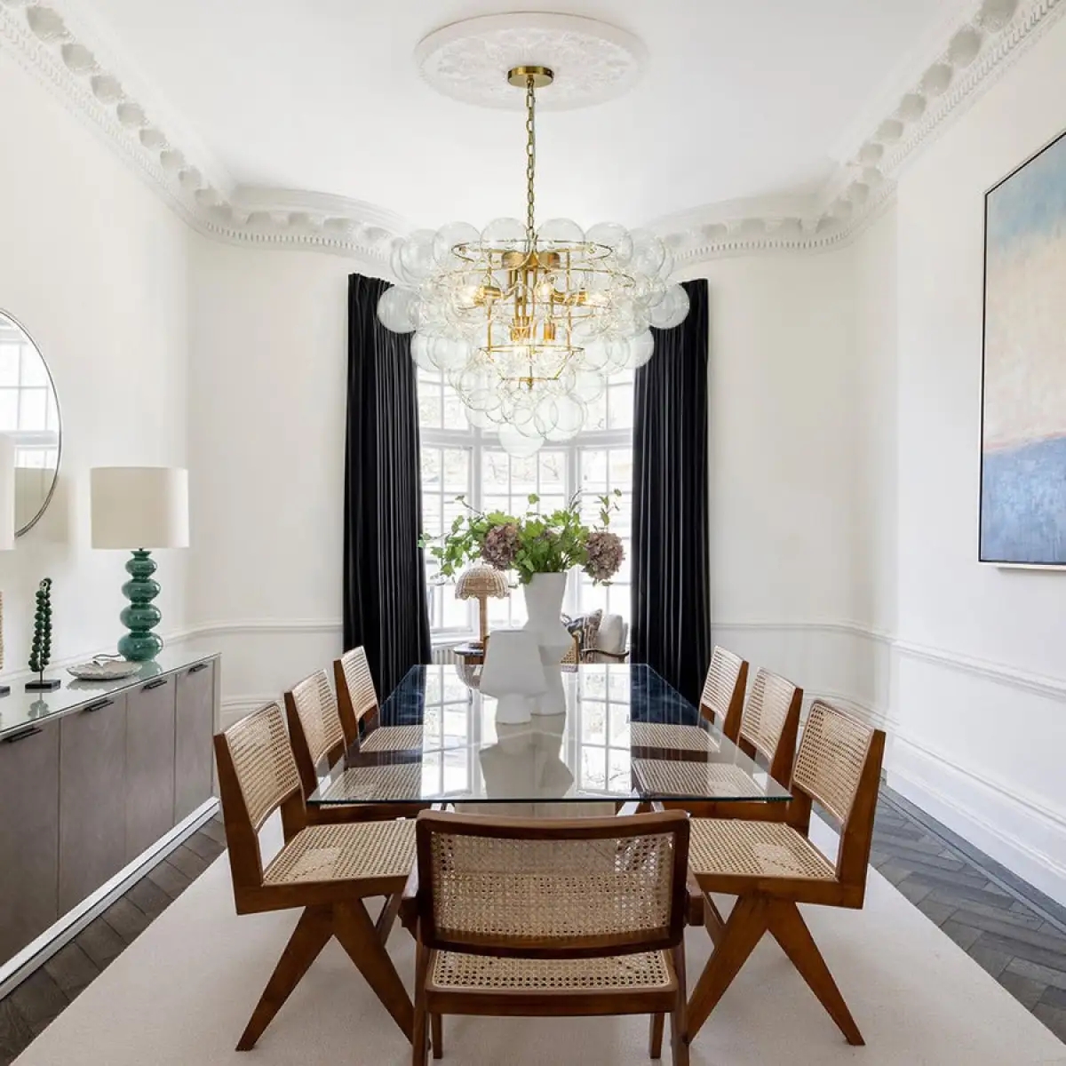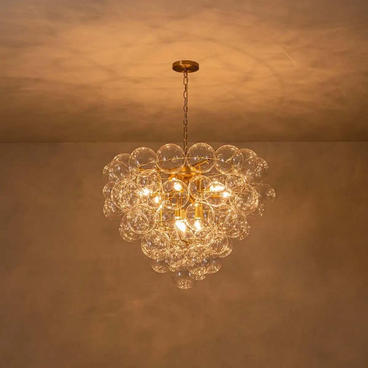 Our elegant glass bubble chandelier exudes an unmatched level of refinement and sophistication, making it a perfect addition to any contemporary living room, entryway, dining area, bathroom, foyer, or bedroom. This opulent cluster globe chandelier features a beautiful arrangement of transparent glass spheres delicately adorning a tapered metal structure. When lit, a warm glow emanates from the sleek brushed brass frame, illuminating the clear glass spheres and creating a mesmerizing bubble effect that will enchant anyone who encounters it.