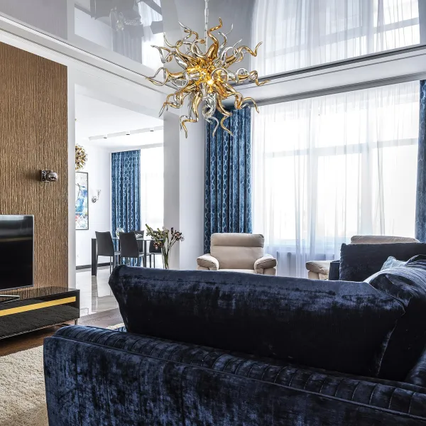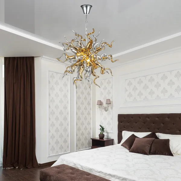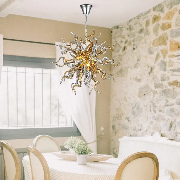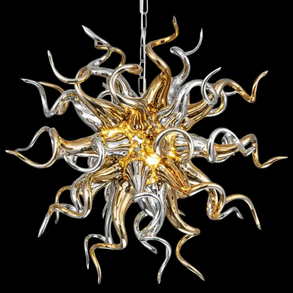 This Sputnik Pendant Light is a structure that consists of hand-blown glass tubes inserted into a metal ball framework, which simplifies the installation process and is suitable for non-skilled individuals. It has gained popularity in the market due to its artistic attributes and stunning appearance.This one use golden and silver to highlight its vibrant tones. Our customers have inspired us to continuously dedicate ourselves to designing lights that combine the Sputnik shape with blown curled glass. Using different color combinations, we create artistic lights that are ideal for modern homes.There are many sizes and models here, you can tell us the size and color, customize your unique chihuly style chandelier at Remshep.